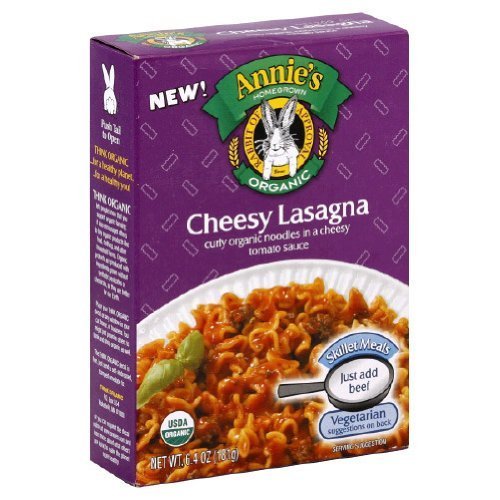 ANNIES HOMEGROWN 6x 6.4 OZ ORGANIC CHEESY LASAGNE. Annies has perfected an organic version of everyones favorite meal. Annies organic easy cheesy lasagna is made with curly organic noodles and a cheesy tomato sauce. Just add ground beef or a vegetarian alternative and water for an easy meal you can feed your kids anytime.:. (Note: This product description is informational only. Always check the actual product label in your possession for the most accurate ingredient information before use. For any health or dietary related matter always consult your doctor before use.)