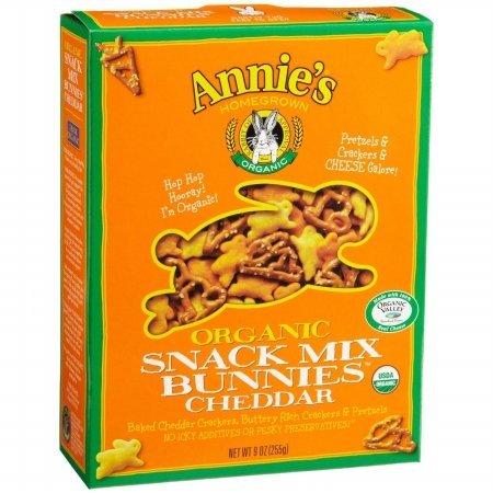 ANNIES HOMEGROWN 12x 9 OZ ORGANIC BUNNIES CHEDDAR SNACK MIX. Cheddar Bunnies and Buttery rich bunnies are lightly seasoned with cheddar cheese, then mixed together with bunny-shaped pretzels for a cheesy-flavored snack mix.Cheddar Organic Snack mix Bunnies offers a better-for-you alternative for health-conscious snacks.:. (Note: This product description is informational only. Always check the actual product label in your possession for the most accurate ingredient information before use. For any health or dietary related matter always consult your doctor before use.)
