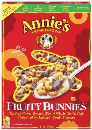 ANNIES HOMEGROWN 12x 9 OZ FRUITY BUNNIES CEREAL. Annies fruity bunnies toasted corn & whole oat cereal - with natural fruit flavors - bunnies, flowers and cotton tails made from toasted corn and whole grain oats with real peach and pear juice! :. (Note: This product description is informational only. Always check the actual product label in your possession for the most accurate ingredient information before use. For any health or dietary related matter always consult your doctor before use.)
