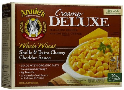 A Deluxe Pasta with Wheat Shells Annie's Homegrown Deluxe Whole Wheat Shells & Extra Cheesy Cheddar is a creamy and cheesy pasta made using real aged cheddar cheese. Easy to cook, this pasta offers a rich and delightful taste that you won't be able to resist. You can cook the pasta as a snack or as a meal at any time of the day. A vegetarian product Good source of fiber and 100% whole grain Good source of protein and calcium Grown and processed without GMOs Enjoy the Annie's Homegrown Deluxe Whole Wheat Shells & Extra Cheesy Cheddar whole grain pasta with cheese for a rich taste and please everyone with your culinary skills. Just For You: Everyone, especially vegetarians Essential Elements: The cheesy treat with whole grain pasta is a good source of protein, and calcium. It contains milk and wheat ingredients. Free of: Trans fat, yeast, GMOs, artificial flavors and preservatives